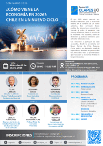 Sr. Felipe Larraín B., director de CLAPES UC le invita al seminario “¿Cómo viene la economía en 2026?: Chile en un nuevo ciclo”. Esta actividad se realizará el día miércoles 07 de enero de 2026 entre las 09:00 y 10:35 hrs. en el Aula Magna Manuel José Irarrázaval, Casa Central UC. Av. Lib. Bernardo O´Higgins 340, Piso 1.
