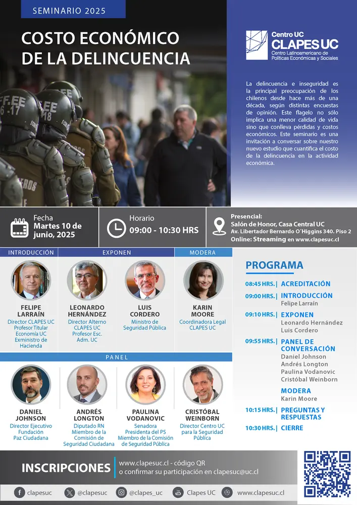 Sr. Felipe Larraín B., director de CLAPES UC le invita al seminario “Costo económico de la delincuencia”. Esta actividad se realizará el día martes 10 de junio de 2025 entre las 09:00 y 10:30 hrs. en el Salón de Honor, Casa Central UC. Av. Libertador Bernardo O´Higgins 340. Piso 2.