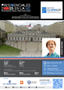Sr. Felipe Larraín B., director de CLAPES UC le invita al ciclo de seminarios presidenciales 2025 «Propuestas para Chile 2026-2030» con nuestra primera invitada: la candidata presidencial de Chile Vamos, Evelyn Matthei. Esta actividad se realizará el día martes 24 de junio de 2025 entre las 09:00 y 11:00 hrs. en el Salón de Honor, Casa Central UC. Av. Libertador Bernardo O´Higgins 340. Piso 2.